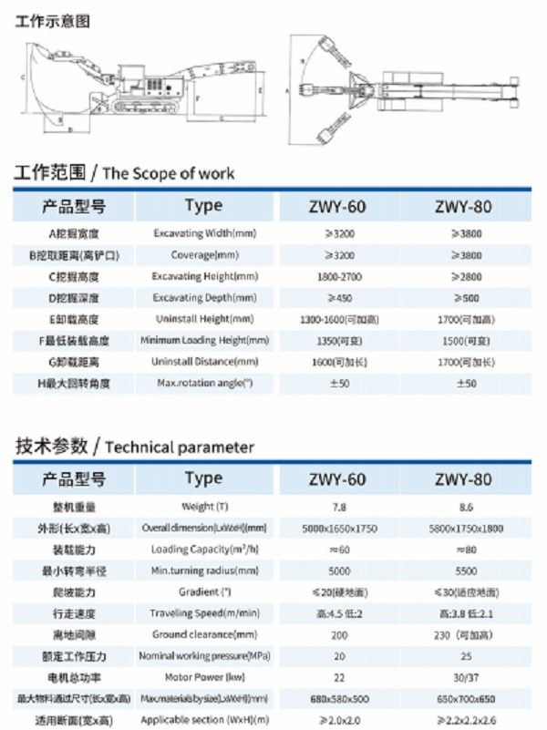 ZWY-60/80 履带输送带挖掘式装载机是一种连续生产的高效率出矿设备,主要用于空间狭窄的 洞采作业,如金属矿,非金属矿,引水巷道等,其作用是采集各工程的碎石土料并输送、装车,本机 靠履带行走、推动力大、扒取范围广、全断面装岩、不留死角、不需人工辅助清理工作面。
